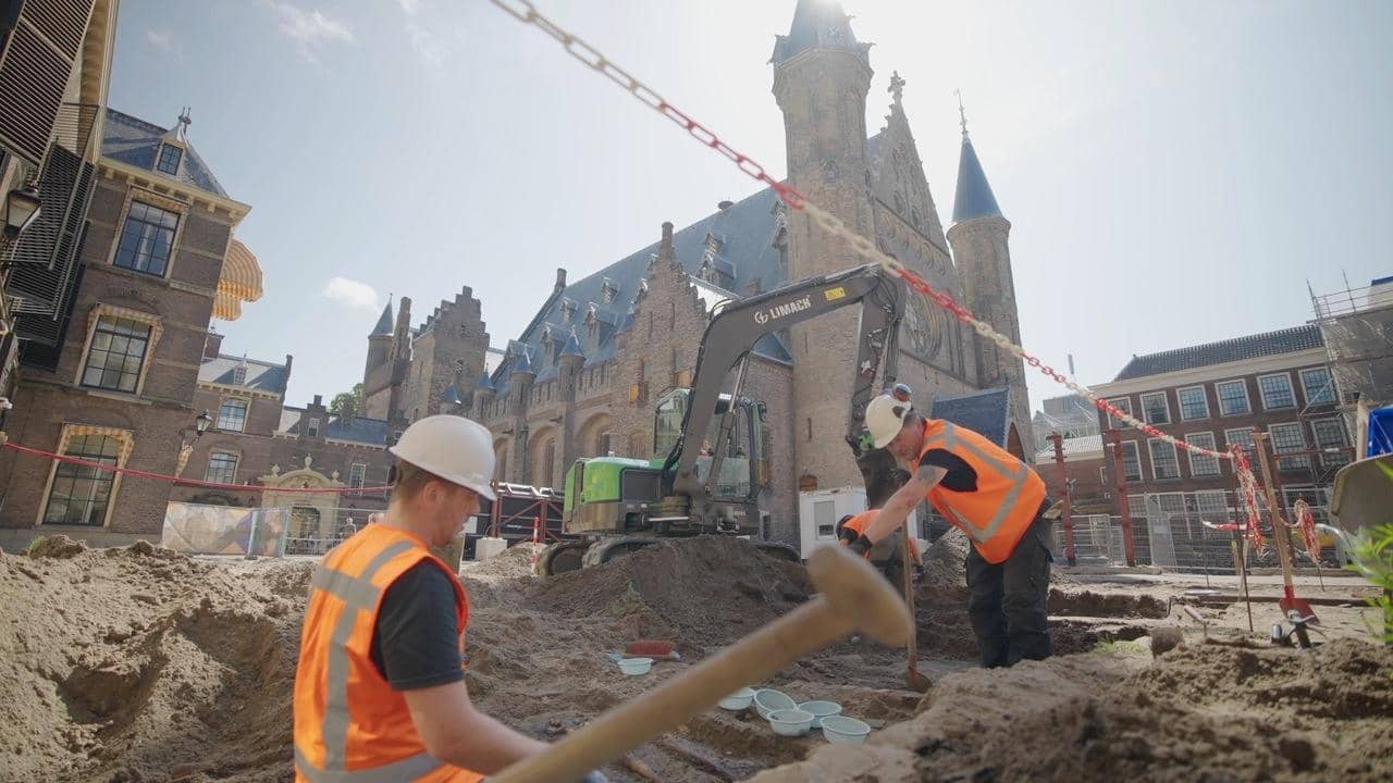 (Beeldtitel: Binnenhof Renovatie. Onderzoek grafkelder Hofkapel. Beeldtekst: Het archeologisch onderzoek is op 10 juli van start gegaan naar de grafkelder onder de voormalige Hofkapel.)
