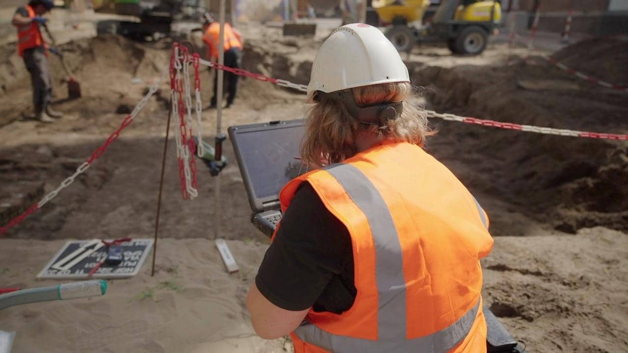 (Versnelde beelden van mensen met oranje veiligheidshesjes aan en witte helmen op die druk bezig zijn met het archeologische onderzoek op het Binnenhof. Een elektrische machine helpt hen met het afgraven van de grond.)