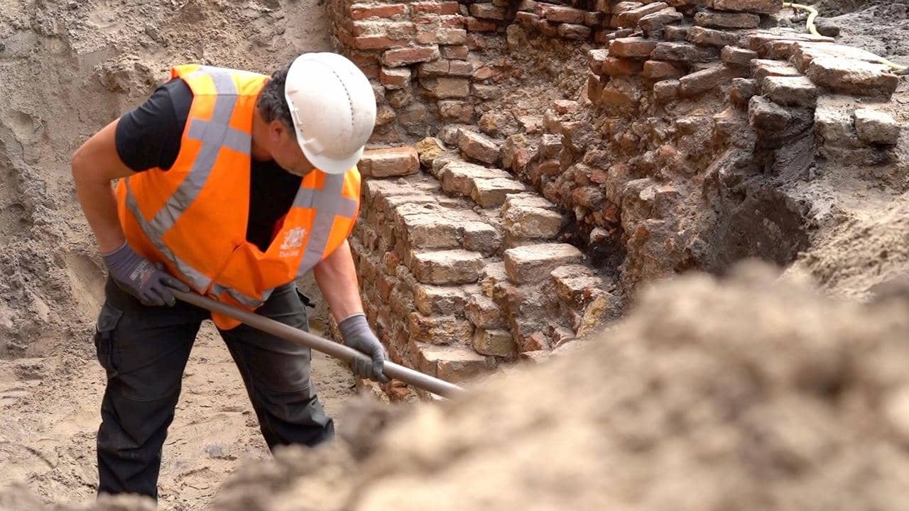 De eerste negen baksteenlagen zijn niet gemetseld maar gestapeld met zand, daarna zijn de bakstenen tot vlak onder het maaiveld met kalkmortel gemetseld. Om toch uiteindelijk boven het maaiveld horizontaal een gevel te kunnen bouwen, werd net iets onder het maaiveld de bakstenen funderingsconstructie waterpas gemaakt. Dat deden de bouwvakkers destijds door een zogenaamde ‘varkenslaag’ aan te brengen. Deze corrigerende laag bestaat uit dunne stukjes gekapte baksteen en/of mortel. Daarna kon de hele gevel volledig waterpas tot aan de dakrand gemetseld worden.