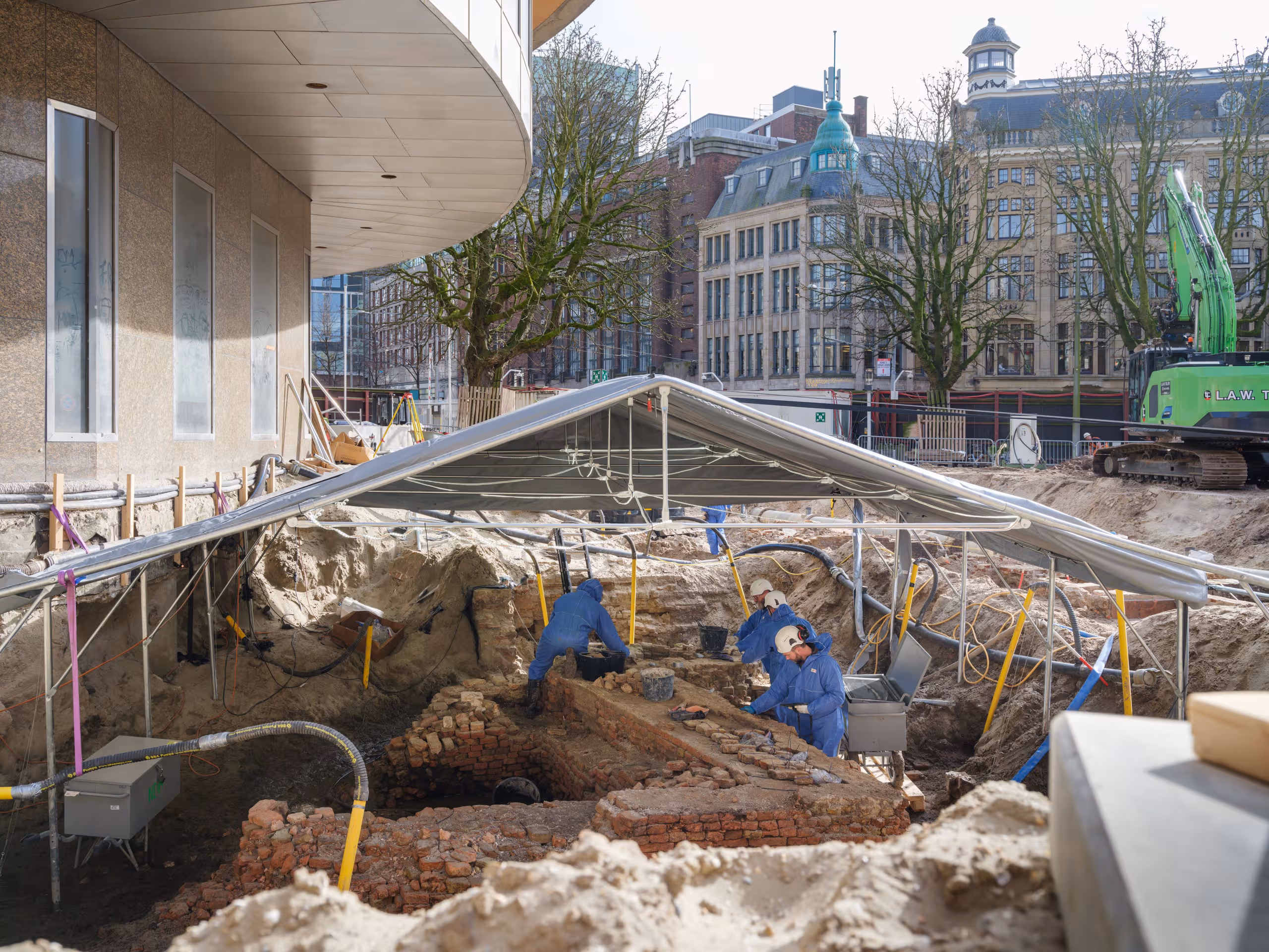 De demontage van de Spuipoort is in volle gang. De funderingsresten komen terug in de nieuwe publieksentree van de Tweede Kamer.